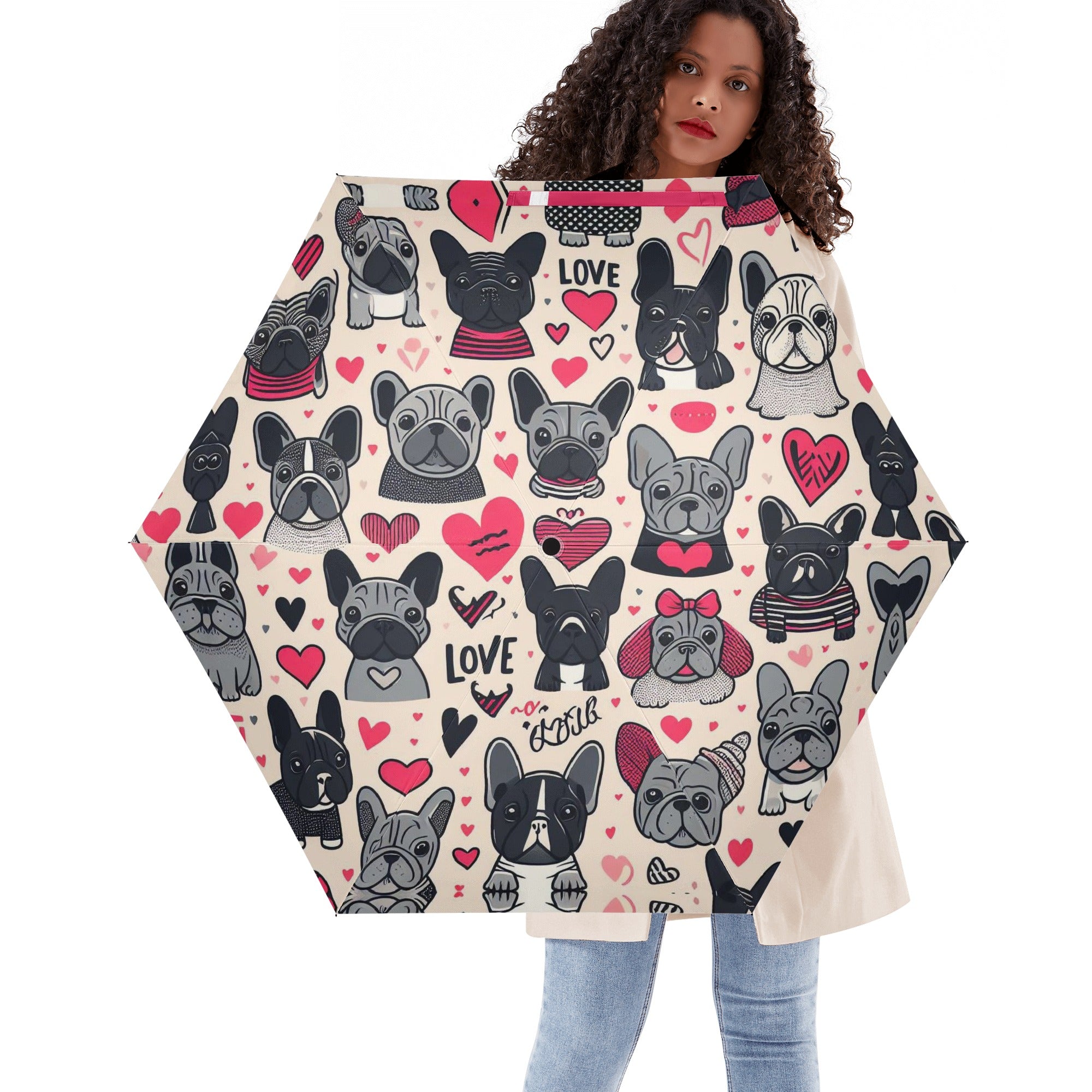 - Stylish Design: The outside print area covers each panel entirely, featuring elegant black designs and adorable French Bulldog motifs. The inner side also maintains an all-black style, adding to its sophisticated look.